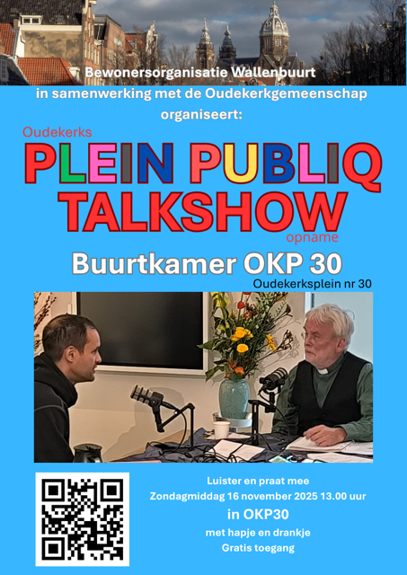 Spiegelbeeldig liggen de oudste en jongste buurtkamer van de Wallen tegenover elkaar op het plein: de Oude Kerk en OKP30, de buurtkamer van Stichting Bewonersorganisatie Wallenbuurt. De idee is ontstaan om uit beide geledingen een serie buurtgesprekken te organiseren: hoe blikt de Oude Kerk Gemeenschap op de haar omringende buurt en welke ontwikkelingen in de buurt acht Wallenbuurt van belang voor de Oude Kerk. Hoe kunnen beide elkaar inspireren en aanvullen?
