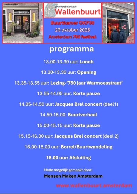 Update: het Jacques Brel-concert en het buurtverhaal (tussen 14:00 en 16:00 uur) zullen worden gehouden op de locatie 'Paleis van de Weemoed' ( Oudezijds Voorburgwal 15) en niet in OKP30. De lunch, de lezing en ook de afsluitende borrel vinden wel in OKP30 plaats, aan het Oudekerksplein 30A.